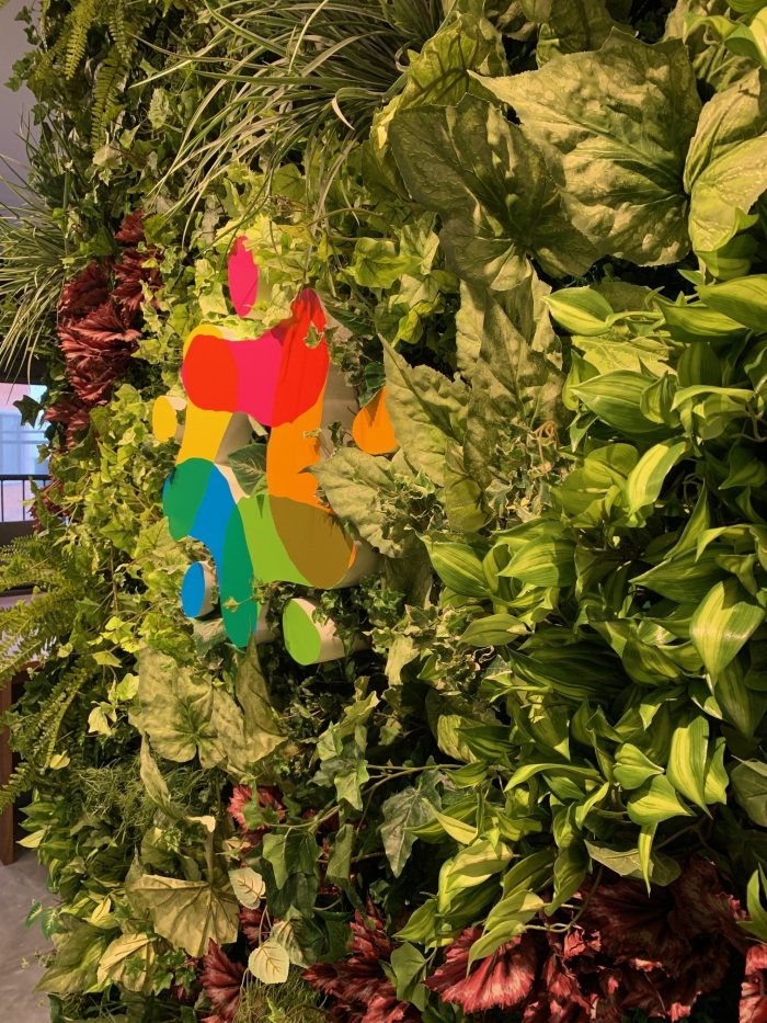 福岡市南区大橋にありますオフィスの壁に南国チックな壁面緑化(フェイクグリーン)を製作設置させて頂きました。グリーンの中に赤や白を入れ、モンステラやヤシなども入れました。