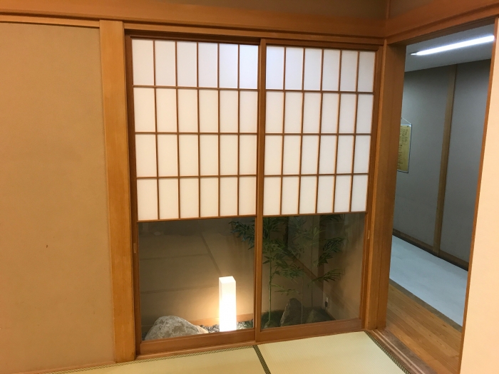 ホテル内の和室の雪見障子の中に竹の装飾をさせて頂きました。